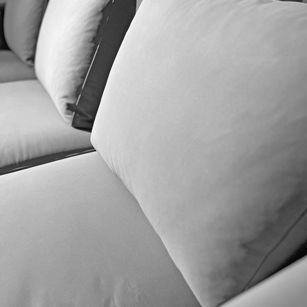 I cuscini schienali creano situazioni di pieno e vuoto e lasciano intravedere abilmente il disegno che dal bracciolo prosegue per tutto lo schienale. Lo stesso disegno che ne esalta i cuscini decoro che completano il confort della relax.